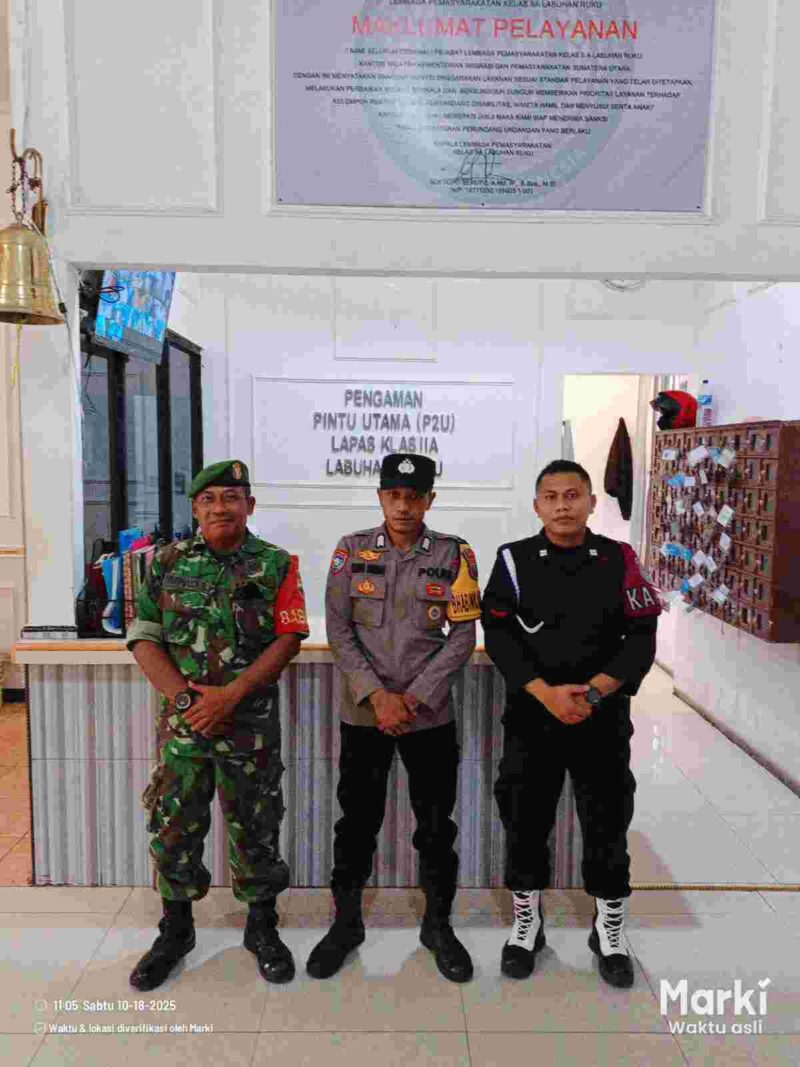 Labuhan Ruku – Polsek Labuhan Ruku meningkatkan pengamanan di Lembaga Pemasyarakatan (Lapas) Klas IIA Labuhan Ruku pada hari Sabtu (18/10/2025), sebagai upaya preventif menjaga stabilitas keamanan dan ketertiban di wilayah hukumnya. Kegiatan pengamanan ini dilaksanakan mulai pukul 10.00 WIB hingga selesai.